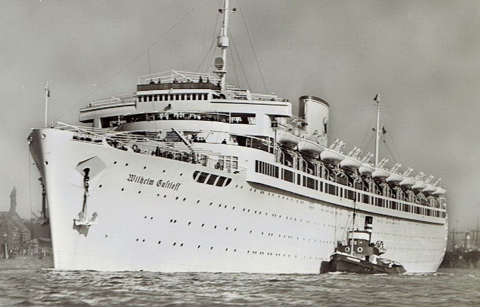 het Duitse vluchtelingenschip "Wilhelm Gustloff" raakten. Aan boord waren vooral vrouwen en kinderen.