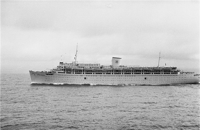 Ook de ‘Wilhelm Gustloff’, voor korte tijd het grootste cruiseschip ter wereld, ligt afgemeerd in de haven.