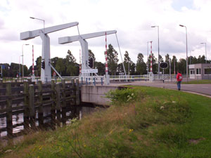 We bereiken nu een kruispunt van waterwegen, de Vecht kruist het Overijssels Kanaal. Een mooi plekje waar we via een stuw en sluis de overkant bereiken. Hier zitten twee vissers die ons ook alweer aanspreken, want hij had al zoveel wandelaars zien langs komen, wel 100. Dat lijkt ons wat overdreven, maar we vertellen hem ons doel van hier langskomen: het Pieterpad. Hij begrijpt het en begint een heel verhaal over wandelen en hoe goed hij daar in is en hoe ver hij kan lopen en zo meer. Het zal wel, ik denk dat het visserslatijn is. Wel een vriendelijke man overigens.