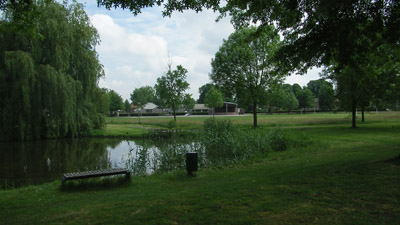 We wandelen Afferden binnen en zien de voor ons bekende vijver.