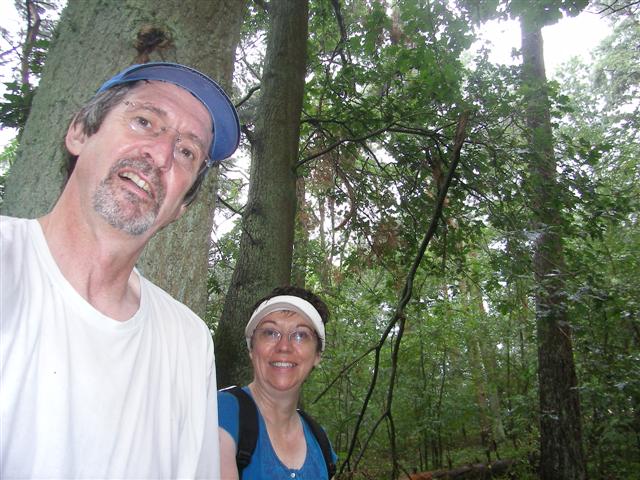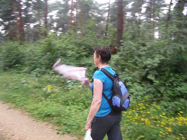 Het regent niet meer, maar we zijn kletsnat en lopen weer. Of het door het vochtige weer komt, maar we worden aangevallen door steekvliegen (ik noem ze dazen) en al wapperend met een zakdoek moeten we steeds om ons heen blijven meppen om ze te verjagen.