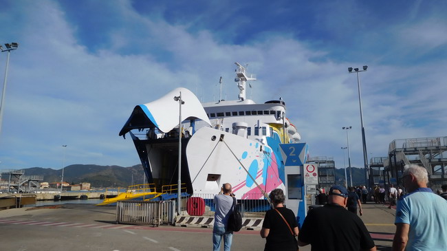 De bus maakt de overtocht in de buik van de veerboot mee.