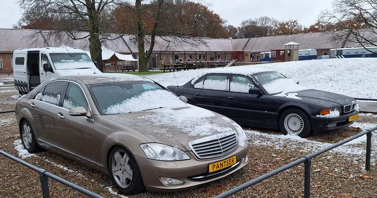 buitenterrein, waar een Mercedes en een BMW ten toon gesteld
