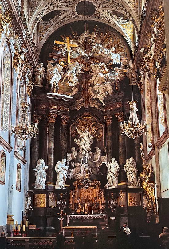 biddende en knielende mensen. Het barokke interieur van de