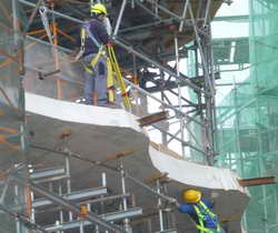 Veel bouwkranen en stellages bedekken de halve kerk,