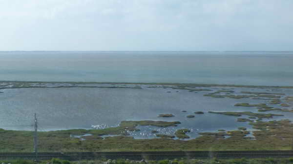 De witte puntjes zijn flamingo's.