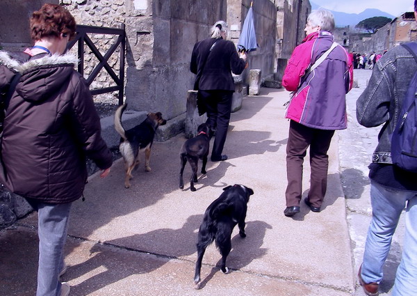 een pittige tante. En inderdaad, tijdens onze wandeling door Pompei verschijnen plots een drietal honden, die kwispelstaartend om haar heen dansen. Ze opent haar tas en haalt een zakje met worstjes tevoorschijn. Het zijn van die slappe knakworstjes die ze in Italië blijkbaar in plastic zakjes verkopen. De honden schrokken de worstjes in no-time naar binnen, lopen vanaf nu achter haar aan en voegen zich bij ons gezelschap!