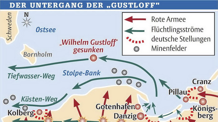 het Duitse vluchtelingenschip "Wilhelm Gustloff" raakten. Aan boord waren vooral vrouwen en kinderen.