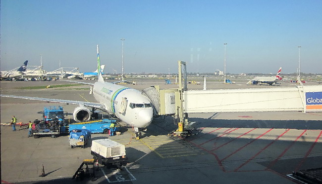 Het is en blijft de enige keer dat we de buitenkant van "ons" vliegtuig zien. Op de terugreis zullen we de buitenkant