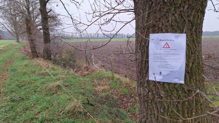 Rode linten en alarmerende papieren op bomen waarschuwen voor de