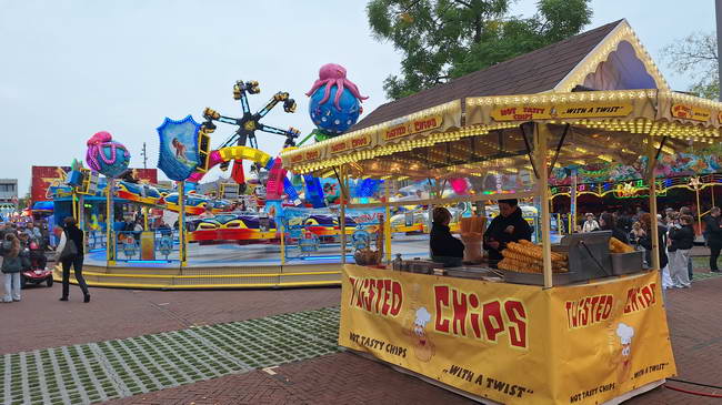 weer in de bebouwde kom. Van verre zien we een reuzenrad boven de
