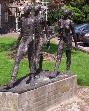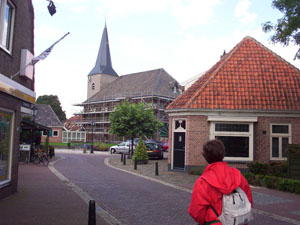 Niet langer gedraald, ons eindpunt komt in zicht. We naderen het dorp Gramsbergen, het dorp van schaatser Erik Hulzebosch. We hebben hem echter niet gezien. We lopen door tot bij de kerk en laten ons neer op een terras tegenover het Pieterpad monument. Ik vind dat ik wel een lekker tapbiertje verdiend heb, maar even later komt de serveerster terug: "... of een flesje Grolsch ook goed is?" Ze zijn net de leidingen aan het doorspoelen; dat heb ik weer! Wanneer we afrekenen om naar de trein te gaan, hoor ik een gast een biertje bestellen. Ja hoor, dat kan, ze zijn klaar met de leidingen.