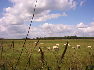 De vader en de 2 zonen blijven in onze buurt lopen, we krijgen ze niet "los". Ook al omdat we regelmatig blijven staan om foto's te nemen van de bijzonderheden die we onderweg tegenkomen. Tijdens het passeren van alleenstaande boerderijen en die zijn er hier nogal veel, worden we steevast begeleid door loslopende blaffende honden die wel netjes op het erf blijven. Deze honden worden dan ook prompt op de foto vastgelegd. Even verder enkele lieflijke schaapjes in een weiland: ook een foto waard. Dit ontlokt aan een van de zonen die ons net voorbijloopt de vraag aan zijn vader: "Hoe komt het toch dat Pieterpadlopers altijd foto's van dieren maken?" Het antwoord van de vader bereikt onze oren niet.