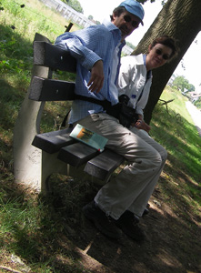 Via de uiterwaarden van de Maas lopen we langs Velden, zuidwaarts richting Venlo. Veel tuinbouw en kassen, en uiteraard de Maas. Na 5 km gaan we effe verpozen op dit bankje. De zelfontspanner doet zijn werk, de camera ligt op een prullenbak (vandaar een beetje scheef).
