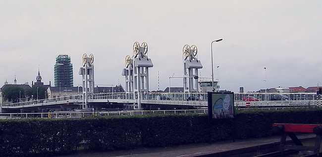 Boven de brug torenen vier grote wielen op palen waarmee het wegdek omhoog getakeld kan worden.
