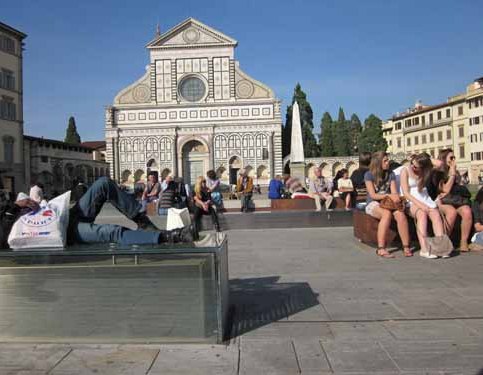 Florence (denken we). Voor een kerk, de Santo Spirito, zit